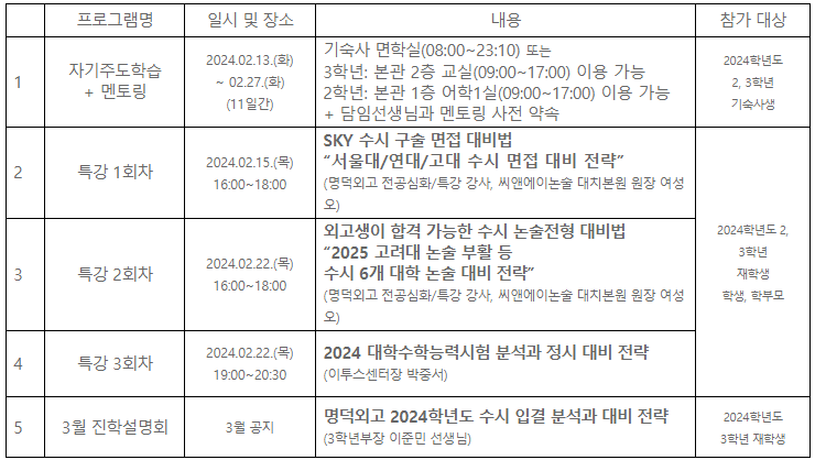 ½ÅÇг⵵¸¦ ´ëºñÇÑ º»±³ ÀçÇлýµéÀÇ ÀÚ±âÁÖµµÇнÀ ¿ª·® °È¿Í Áø·Î ¿ª·® °È¸¦ À§ÇØ ´ÙÀ½ ÇÁ·Î±×·¥°ú ÁøÇм³¸íȸ(Ư° 1-2ȸÂ÷ ¼ö½Ã´ëºñ ÃֽŠ³í·±¸¼ú ÃâÁ¦ ¹× äÁ¡ ¿ø¸® ¾È³» “¸ðµç ÇÕ°Ý ´ä¾ÈÀº Á¦½Ã¹® µ¶ÇØ¿Í ¹®Á¦ ºÐ¼®¿¡¼ Ãâ¹ßÇÑ´Ù”¿Í Ư° 3ȸÂ÷ 2024 ´ëÇмöÇдɷ½ÃÇè ºÐ¼®°ú Á¤½Ã ´ëºñ)¸¦ ÁغñÇÏ¿´À¸´Ï Çлý, Çкθð´Ô²²¼´Â ´ëÀÔ Áغñ¿¡ ¸¹Àº µµ¿òÀ» ¹ÞÀ¸½Ã±æ ¹Ù¶ø´Ï´Ù.