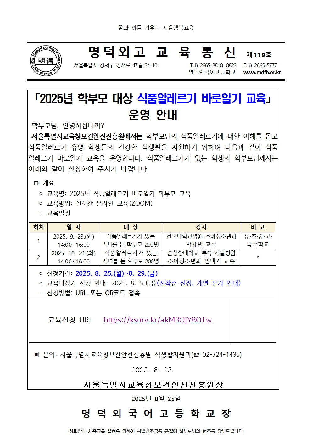 Á¦119È£ 2025³â Çкθð ´ë»ó ½Äǰ¾Ë·¹¸£±â ¹Ù·Î¾Ë±â ±³À° ¿î¿µ ¾È³»